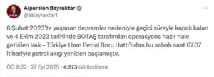 Enerji Bakanı Bayraktar, depremler sonrası kapalı kalan petrol hattının akışının yeniden başladığını duyurdu.